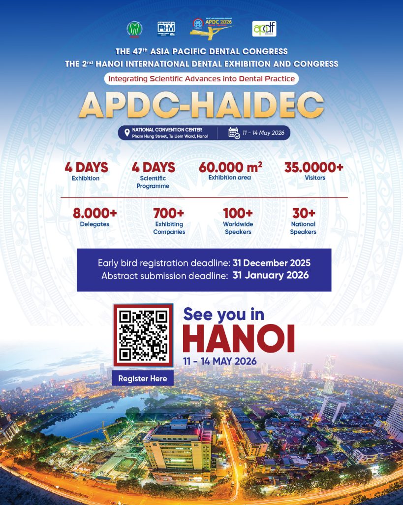 Lần đầu tiên tại Việt Nam, Hội nghị Nha khoa Châu Á – Thái Bình Dương lần thứ 47 (APDC 2026) sẽ được tổ chức tại Hà Nội, kết hợp cùng Hội nghị Khoa học & Triển lãm Răng Hàm Mặt Quốc tế Hà Nội lần 2 (HAIDEC 2026). Đây là sự kiện nha khoa mang tầm vóc quốc tế, hứa hẹn mang đến những trải nghiệm học thuật, triển lãm và kết nối chuyên môn đẳng cấp nhất trong ngành Răng Hàm Mặt.